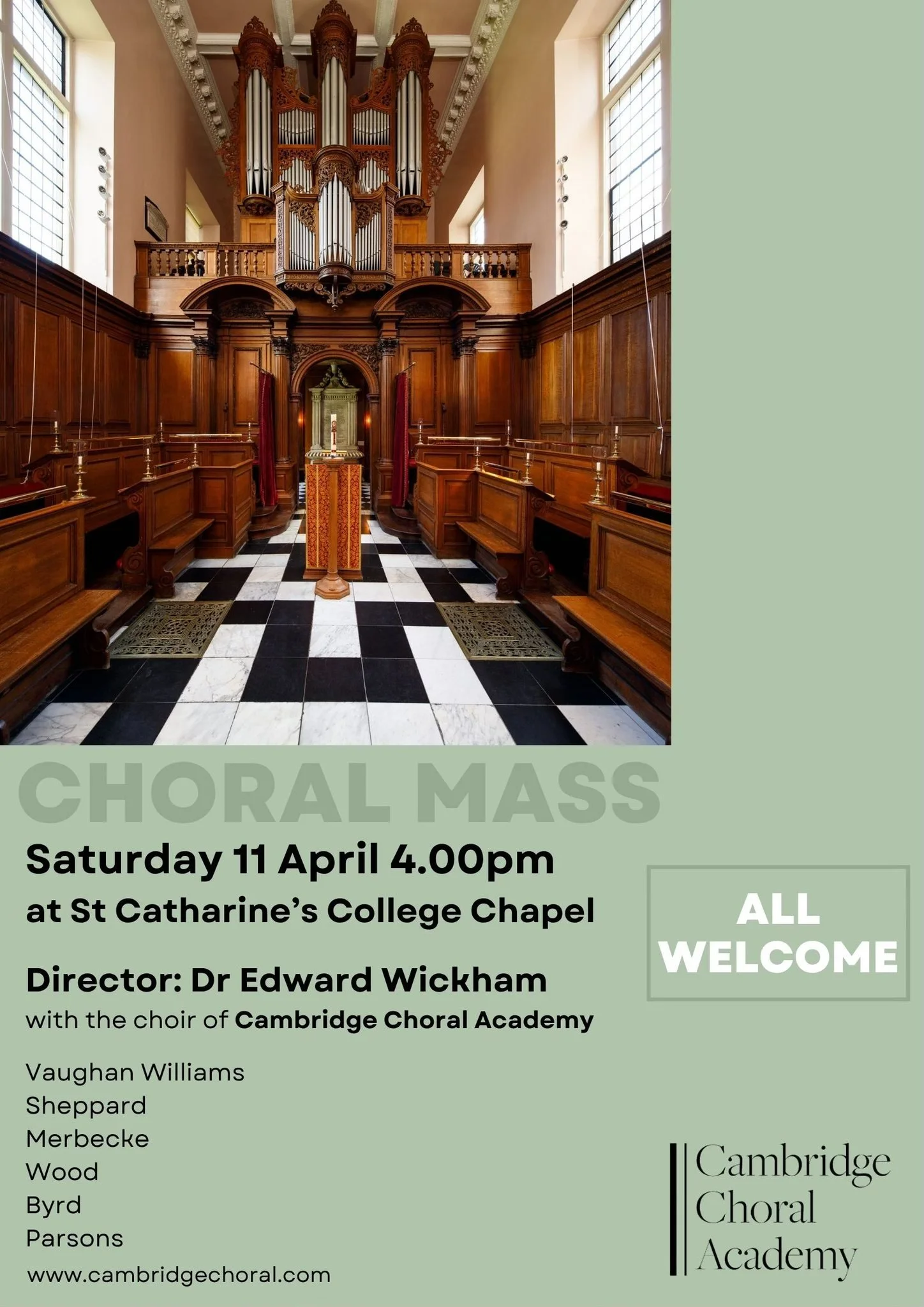 Choral Mass sung by the choir of Cambridge Choral Academy under the direction of Dr Edward Wickham. Music by Vaughan Williams, Sheppard, Merbecke, Wood, Byrd, Parsons.