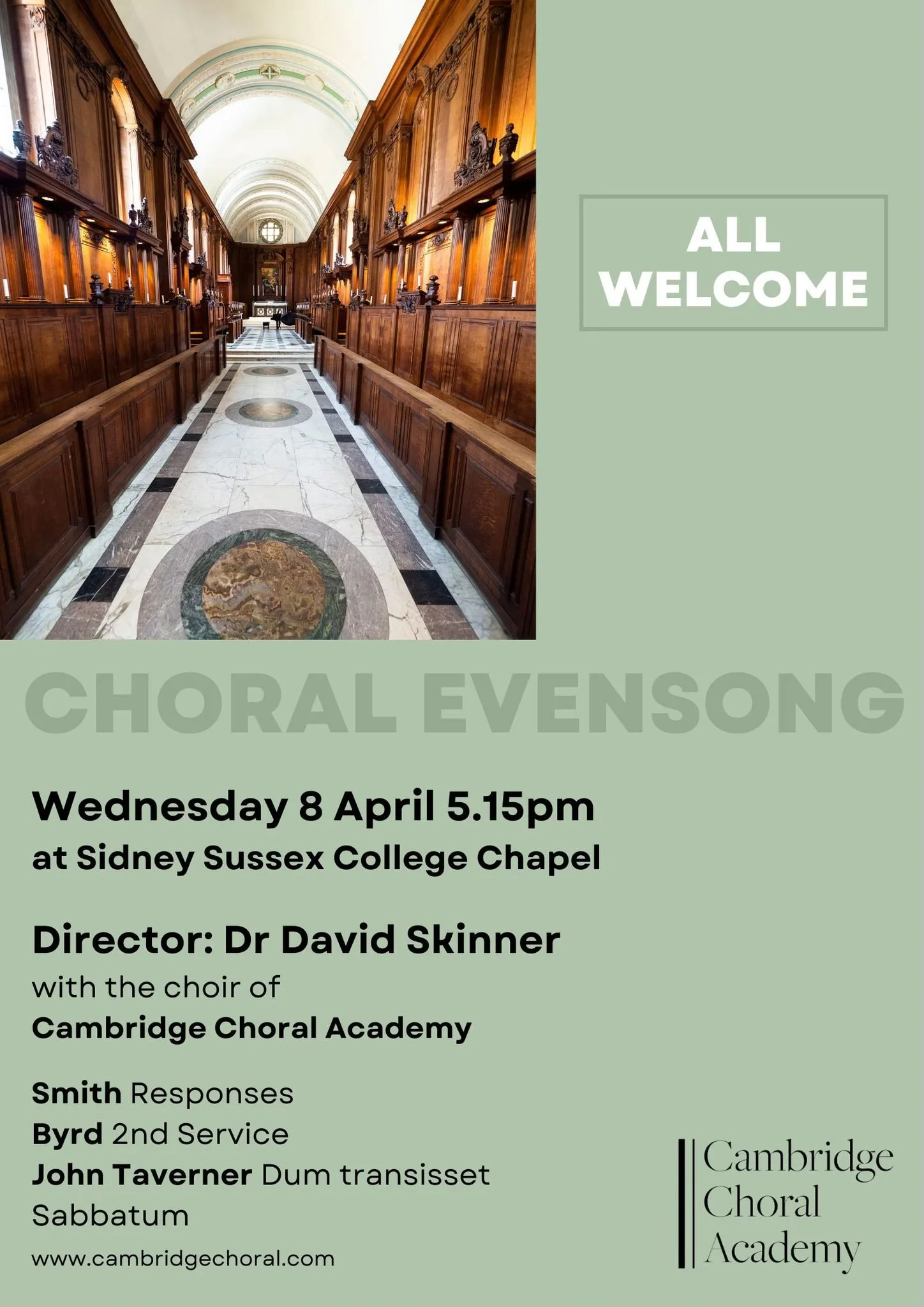 Includes Smith Responses, Byrd 2nd Service, Taverner Dum transisset. Sung by Chambridge Choral Academy. Director Dr David Skinner.